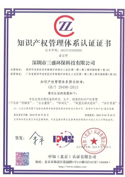 恭喜深圳市三盛環(huán)保科技有限公司榮獲《知識產(chǎn)權(quán)管理體系認(rèn)證證書》